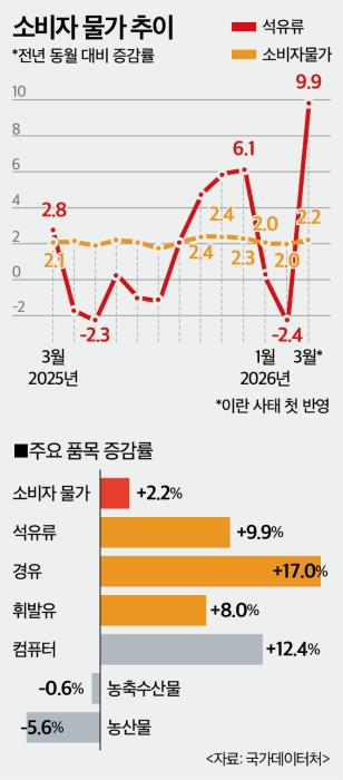 메뉴설정 홈 > 정책 > 전체 중동 쇼크 현실화…석유류 '41개월래' 최대폭 상승 중동 전쟁의 여파가 소비자물가에도 반영되는 모습입니다. 정부의 최고 가격상한제 등 물가안정 정책에도 불구하고 중동발 충격이 반영된 3월 석유류 물가는 41개월 만에 최대 상승폭을 기록했습니다. (그래픽뉴스토마토) 석유류, 우크라 이후 가장 큰 폭 상승 재정경제부가 2일 발표한 '3월 소비자물가동향'에 따르면 석유류 물가 전년 동월 대비 9.9% 상승했습니다. 이는 러시아·우크라이나 전쟁... 유가 상승도 '이란' 탓 …"미국 석유 사라" 종량제 사재기 논란에…품질검수 '1/10' 단축 중동 리스크에 자동차 수출 '불안'…정부, 물류비·금융 총력 지원 최신기사 관세·중동전에 'EU 환경 장벽'까지…한국경제 '기로' 2026.04.01 17:49 미국 관세 등 보호무역주의와 중동 전쟁이라는 기존 변수에 이어 최근 유럽연합(EU)의 플라스틱 지침이 새로운 '암초'로 부상하고 있습니다. 글로벌 환경이 이른바 '다중 위기(Polyc... 예측 어려운 '중동사태'…어업인 단체도 100억 '추경' 2026.04.02 15:39 수협중앙회가 중동사태에 따른 어업용 유가 안정을 위한 예산을 편성합니다. 어업인을 대상으로 100억원 이상의 유류비를 지원한다는 방침입니다. 수협중앙회는 2일 '중동전쟁 ... 갯벌 '2차 청사진'…블루카본 실증연구·해양생태계 지불제 도입 2026.04.02 14:28 우리나라 갯벌의 체계적인 보전과 효율적인 이용을 위한 향후 5년간의 청사진이 나왔습니다. 이번에 확정된 제2차 갯벌관리 기본계획(2026~2030)의 핵심은 갯벌의 단순 보존... 초·중·고교에 '해양교육'…중부내륙·호남에는 '바다 개관' 2026.04.02 15:19 전국 초·중·고교 교육과정에 해양교육을 정규화하고 교원·전문인력 양성체계도 구축합니다. 해양문화시설이 없는 중부내륙권과 호남권에는 각각 국립청주해양과학관과 국립... 사상 첫 '월 800억달러' 수출…중동 사태 이겨낸 '반도체 슈퍼사이클' 2026.04.01 17:33 지난달 수출이 사상 처음으로 800억달러를 돌파했습니다. 중동 전쟁으로 원자재 가격과 물류비가 상승했음에도 반도체 슈퍼사이클에 힘입어 견조한 증가세를 이어간 것으로 분... 박홍근 "전쟁 추경, 국회 통과 즉시 집행할 것" 2026.04.03 10:53 박홍근 기획예산처 장관이 중동 전쟁 대응을 위한 '전쟁 추경'의 신속한 집행을 강조했습니다. 이에 국회 통과 즉시 집행에 나서는 한편, 제도 전반을 성과 중심으로 개편할 방침입... 더보기