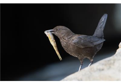 2026.03.27 11:19  물까마귀가 덕유산 구천동 계곡에서 물고기를 잡아 바위에 내리친 뒤 주변을 살피고 있다. 덕유산 구천동 계곡에서의 일입니다. 그늘진 바위에는 아직 겨울의 찬 기운이 남아 있...